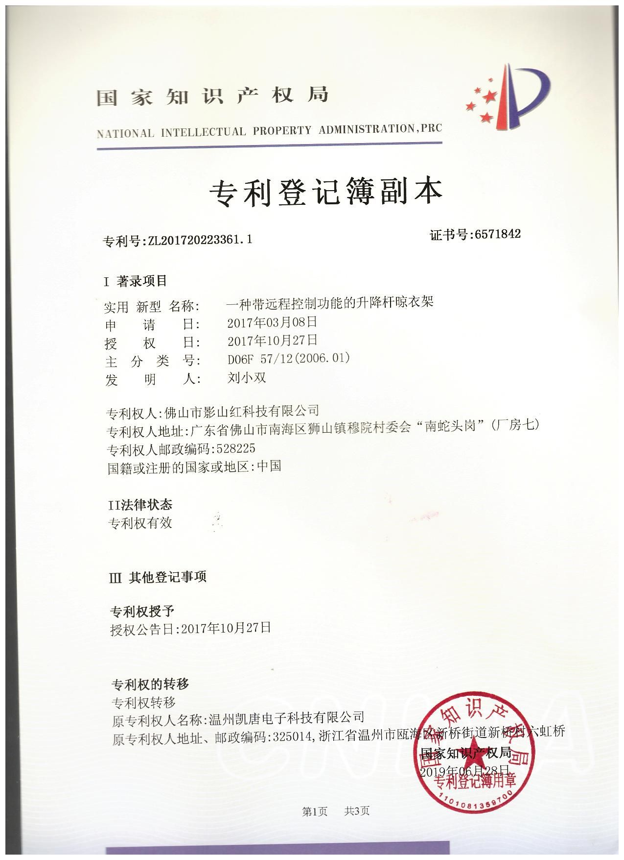 廣東電動(dòng)晾衣架廠 佛山電動(dòng)晾衣架廠 陽光雅居智能電動(dòng)晾衣架廠 佛山市影山紅科技有限公司 經(jīng)過技術(shù)工程師團(tuán)隊(duì)的研發(fā)和突破,成功申請(qǐng)并榮獲國家知識(shí)產(chǎn)權(quán)局頒發(fā)的《一種帶遠(yuǎn)程控制功能的升降桿晾衣架》專利,這是國家知識(shí)產(chǎn)權(quán)局對(duì)我們佛山市影山紅科技有限公司陽光雅居智能電動(dòng)晾衣架廠生產(chǎn)智能電動(dòng)晾衣機(jī)技術(shù)的認(rèn)可與肯定,這也給了我們技術(shù)工程師團(tuán)隊(duì)非常大的鼓舞,我們的技術(shù)工程師團(tuán)隊(duì)也會(huì)不斷努力研發(fā)創(chuàng)新,生產(chǎn)出更智能、方便、安全的晾衣機(jī),給客戶更好的晾衣體驗(yàn)。歡迎國內(nèi)外朋友來加盟代理陽光雅居電動(dòng)晾衣架,歡迎來電咨詢,加盟熱線15818088571、13129081213。