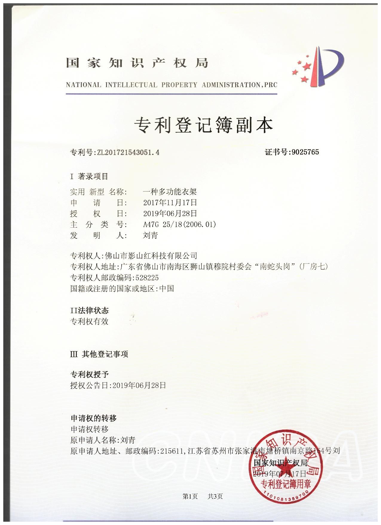廣東電動晾衣架廠 佛山電動晾衣架廠 陽光雅居智能電動晾衣架廠 佛山市影山紅科技有限公司 經過技術工程師團隊的研發和突破,成功申請并榮獲國家知識產權局頒發的《一種多功能衣架》專利,這是國家知識產權局對我們佛山市影山紅科技有限公司陽光雅居智能電動晾衣架廠生產智能電動晾衣機技術的認可與肯定,這也給了我們技術工程師團隊非常大的鼓舞,我們的技術工程師團隊也會不斷努力研發創新,生產出更智能、方便、安全的晾衣機,給客戶更好的晾衣體驗。歡迎國內外朋友來加盟代理陽光雅居電動晾衣架,歡迎來電咨詢,加盟熱線15818088571、13129081213。